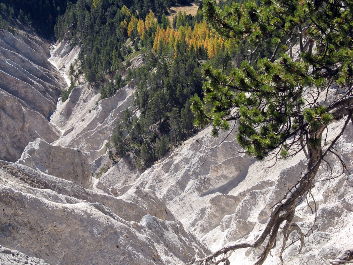 Unter den Sedimentgesteinen findet man noch Gips und Cargneule, die sich in der tiefen Lagune gebildet haben und so bemerkenswerte Landschaften hervorgebracht haben wie die von Casse Deserte bei Arvieux auf der Straße zum Pass Izoard mit ihren Türmen, Minaretten, Steinspitzen…, alle diese trichterförmigen Auflösungen und die beeindruckende weiße Ruine in Monbardon (Château-Ville-Vieille). Wir verdanken diese besonderen Landschaften der Geologie.
